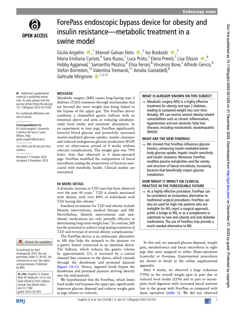 The rodent data obtained with ForePass shows that the device is expected to reach the same unmatched efficacy of metabolic surgery, primarily a remission of insulin resistance and substantial weight loss.